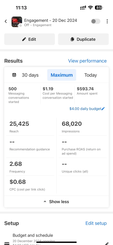 - To as low as $1.21 in some campaigns (e.g., Engagement – 20 Dec 2024)